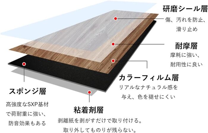 表面はPVC(SPC)材ならではの耐久性にこだわった多機能なフロアシートです。抜群の耐摩耗性を持ち、土足でも長期間ご使用いただける耐久性があります。