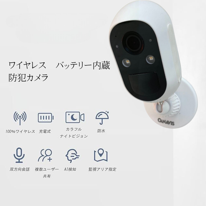 CANAVIS防犯カメラにはリチウム電池が内蔵されており、1回の充電で4~6ヶ月使用でき、頻繁に充電する必要はありません。 置き型タイプ・壁掛けタイプ二つの取付け方があります。配線の制約がないため、屋内や屋外、壁や天井など、さまざまな場所にカメラを簡単に設置することができます。また、在移動や再設置も便利です。(カメラのご使用にはWIFI環境が必要です。)最新の1/3型カラー高性能CMOSセンサーを搭載され、2560 * 1440PフルHD素抜群の高品質画面が実現できて、鮮明な録画映像が可能です。