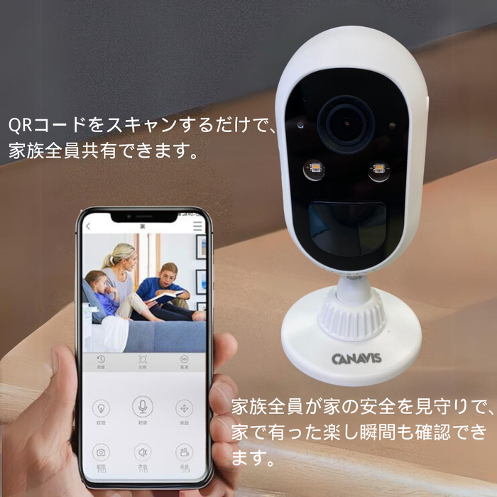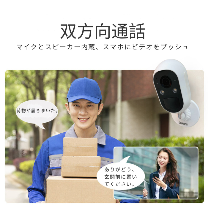 防犯カメラはシェア機能が付なので一台のカメラが複数のスマホで共有され、同時に視聴でき、面白い瞬間を見逃さないです。防犯カメラがマイクとスピーカーを内蔵し、留守番のご家族やペットの様子を見るだけでなく、不審者への威嚇、訪問者の確認などリアルタイムで会話することができます。